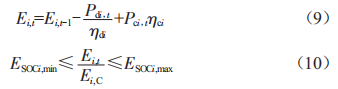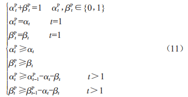 為構(gòu)建蓄電池充放電過程,引入0-1變量aP4和8P4。其中,aEQ \* jc3 \* hps10 \o\al(\s\up 3(=1,8EQ \* jc3 \* hps10 \o\al(\s\up 3(=0表示蓄電池完成一次放電過程,反之為充電過程。蓄電池的時段4充放電過程與前一時段4-1緊密相關(guān)。