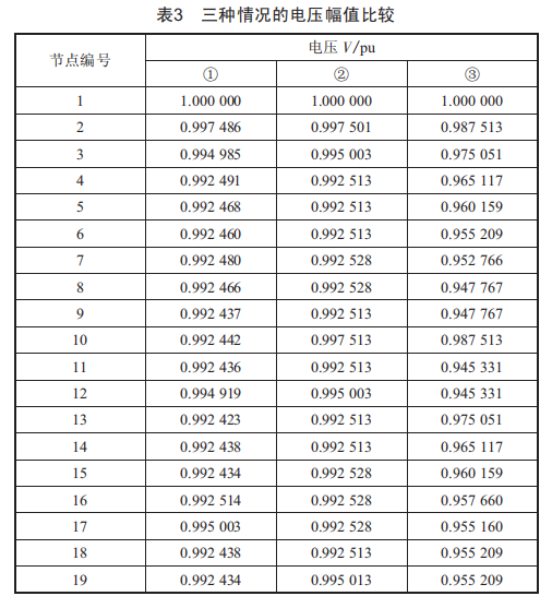 如表3所示,①列表示利用二階錐優(yōu)化模型求解的電壓分布:②列表示將首節(jié)點作為松弛節(jié)點,DG接入的節(jié)點作為恒功率輸入節(jié)點求解得到的電壓分布:③列表示DG并未接入配電網(wǎng)中,系統(tǒng)中的負(fù)荷是通過首節(jié)點所連主網(wǎng)輸送計算得到的電壓分布。對比①和②列,最大偏差量為0.00094。可見,二階錐優(yōu)化能夠準(zhǔn)確實現(xiàn)潮流求解。對比①、②和③可知,通過DG接入配電網(wǎng),能就近將電能提供給負(fù)荷,減少由于長距離功率輸送引起的電壓降,提高了電壓水平,改善了電能質(zhì)量。