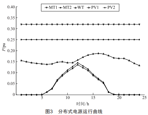 主動配電網(wǎng)能對于小幅度的負(fù)荷及間歇式功率波動做出實時響應(yīng),以修正實際負(fù)荷曲線及間歇式能源發(fā)電出力曲線與預(yù)測曲線的偏差,緩解功率波動。本文采用的間歇性DG為wT和PV,利用微型柴油發(fā)電機)MicroTurbine,MT)配合以平滑間歇性分布式電源的功率波動,減少配電網(wǎng)中的缺供電量。