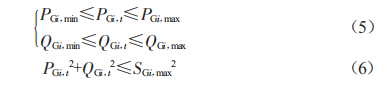 式中,PGi,max、PGi,min為DG有功出力的上下限:0Gi,max、0Gi,min為DG無功出力的上下限:sGi,max為DG的容量最大值。