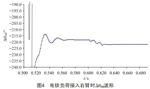 由圖3可知,當(dāng)電鐵在0.6s經(jīng)過時,相角差會受到影響(圖中趨勢為角度增大,此時電鐵接入供電臂左臂),當(dāng)負(fù)荷接入右臂時,由電氣化鐵路輪流換相原理可知,相位差將減小,如圖4所示。