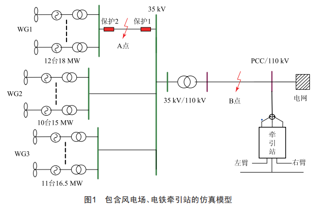 仿真案例:風(fēng)電場集電線A點0.5s時刻發(fā)生短路故障,持續(xù)時間0.2s,PCC點牽引站牽引變?yōu)関v接線方式,單臂供電,0.6s時刻多臺電力機車(負(fù)荷40MW)通過牽引站左臂。