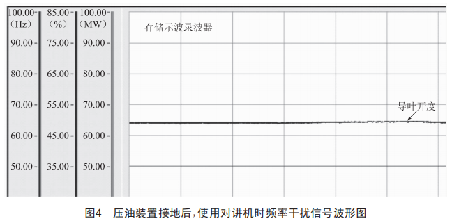 采用一根50mm2的銅導(dǎo)線將調(diào)速器壓油裝置與其他接地扁鋼連接后,再來(lái)做先前發(fā)現(xiàn)的對(duì)講機(jī)通話時(shí)的干擾檢測(cè),發(fā)現(xiàn)干擾源消失。壓油裝置接地后,使用對(duì)講機(jī)時(shí)頻率干擾信號(hào)波形圖如圖4所示。拆開(kāi)臨時(shí)接地線時(shí),干擾信號(hào)再次出現(xiàn),接上接地線,干擾信號(hào)消失。接上接地線后,無(wú)論使用對(duì)講機(jī)還是手機(jī),干擾信號(hào)均不存在。此時(shí)在調(diào)速器機(jī)械柜內(nèi)(電液隨動(dòng)控制系統(tǒng))使用對(duì)講機(jī)或手機(jī),干擾信號(hào)減少一半以上。可見(jiàn)抗干擾能力差的原因是設(shè)備接地不良,干擾信號(hào)直接作用于隨動(dòng)控制系統(tǒng)元件而得不到釋放。對(duì)調(diào)速器壓油裝置重新引接地后,至今運(yùn)行良好,未發(fā)生抽動(dòng)現(xiàn)象。