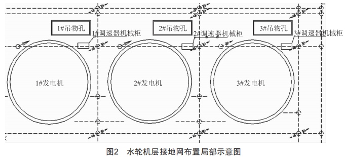 按照設(shè)備接地設(shè)計(jì)要求,小巖頭水電站調(diào)速器機(jī)械柜設(shè)有可靠的接地,只是因土建施工或者室內(nèi)裝修,明接地的接地點(diǎn)無(wú)法看到。但是因?yàn)檎{(diào)速器機(jī)械柜通過(guò)油壓管路與水機(jī)里襯、調(diào)速器接力器等設(shè)備有螺栓可靠連接,就認(rèn)為既有接地扁鐵連接,又有管路連接,調(diào)速器壓油裝置接地良好,不會(huì)有接地不良缺陷問(wèn)題。水輪機(jī)層接地網(wǎng)布置局部示意圖如圖2所示。