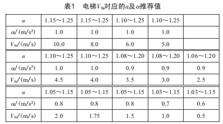 而電梯速度VN與對(duì)應(yīng)的速度系數(shù)a及加速度a推薦值如表1所示。