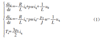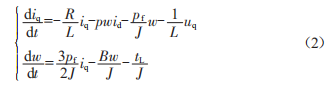 式中,id、iq、ud、uq為d、g軸上的定子電流與電壓:w為機(jī)械角速度:R為定子電阻:L為永磁磁鏈:J為調(diào)速系統(tǒng)等效轉(zhuǎn)動(dòng)慣量。