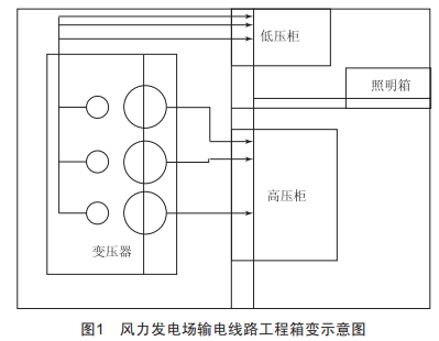 箱變安裝是風(fēng)力發(fā)電場輸電線路工程施工中的重要環(huán)節(jié),在設(shè)備運到現(xiàn)場后,技術(shù)人員要結(jié)合箱變示意圖(圖1)核對產(chǎn)品信息,確保其容量、電壓等級等數(shù)據(jù)符合設(shè)計需求。技術(shù)人員要結(jié)合"拆卸件一覽表"進行核對,保證變壓器的主機及附件完好,要利用16t的調(diào)車進行安裝,在基礎(chǔ)施工養(yǎng)護完成后,結(jié)合中心線位置,將其吊運到基礎(chǔ)上,將其與基礎(chǔ)的預(yù)埋件進行焊接,提出兩根扁鐵,與接地設(shè)置連接。