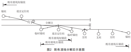 如圖3所示,新渡線長錨段采取延長下錨的方式,延長區(qū)段的長度需滿足線索調(diào)整后分段絕緣器安裝需要(圖中②表示新分段絕緣器接點),臨時錨柱可利用岔區(qū)其余錨柱替代。利用"V型天窗"進行新渡線長錨段承力索架設(shè),架設(shè)完成后投入運營,同步拆除分解后既有渡線長錨段承力索。利用"V型天窗"進行新渡線長錨段