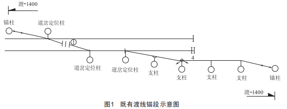 上行、下行間渡線采用站場站線錨段替代時,站線錨段通常需經(jīng)過兩組道岔,分別為:站線與正線間相連接道岔,上、下行正線間相連接道岔。在兩組道岔定位間,站線錨段接觸線抬高,為非工作支。既有渡線錨段示意圖如圖1所示。