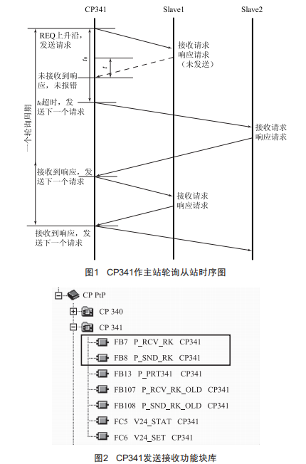 本文以CP341作主站為例,CP341作主站輪詢從站時(shí)序圖如圖l所示,關(guān)于功能塊的信息如圖2、圖3所示。主站通過發(fā)送功能塊FB8向s1avel發(fā)送請求指令,由于slavel斷線故障,沒有收到主站請求,無法返回?cái)?shù)據(jù),且接收功能塊FB7的完成位NDR和報(bào)錯(cuò)位ERR0R無法置位,則當(dāng)超時(shí)定時(shí)器時(shí)間t0超時(shí),主站判斷本條指令失敗,同時(shí)發(fā)起下條指令訪問s1ave2,s1ave2收到主站請求后,將響應(yīng)數(shù)據(jù)返回給主站CP34l,主站將接收到的數(shù)據(jù)保存到指定位置,接收功能塊D0NE置位,同時(shí)觸發(fā)下一次發(fā)送作業(yè)。