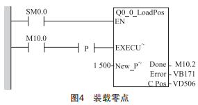 第三步,調(diào)用0001oadPoS功能塊。由于第二步找到的參考點(diǎn)位置與實(shí)際控制要求的參考點(diǎn)有一定的偏差,在本控制系統(tǒng)中偏差值為+15mm,為了清晰地定義絕對位置,必須重新尋找參考點(diǎn),使得原參考點(diǎn)失效。本文中15mm對應(yīng)的脈沖數(shù)為1500個,因此"NewPoS"設(shè)置為"1500",如圖4所示,用于將當(dāng)前位置的絕對位置設(shè)置為預(yù)置值。