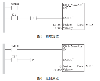 第四步,調(diào)用000MoveAbSolUte功能塊,讓電機(jī)以指定的速度100mm/S運(yùn)動到指定的絕對位置600mm處,如圖5所示。延時3S,再返回原點(diǎn),如圖6所示。