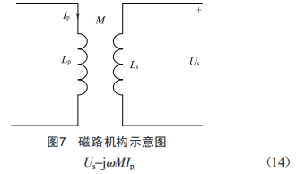 如果將LCL作為原邊諧振補償拓撲,可得到電流恒定的電能發(fā)射線圈。圖7是磁路機構示意圖,當互感皿值確定后,可得副邊感應電壓US,如公式(14)所示。