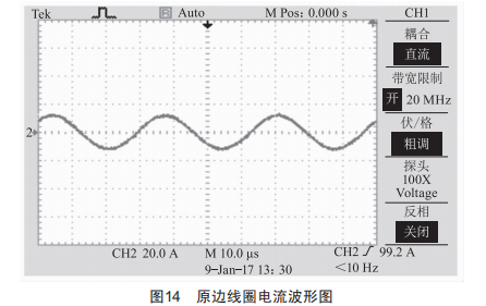 圖14為原邊線圈電流波形圖,可看出電流畸變率很小,波形質量高。
