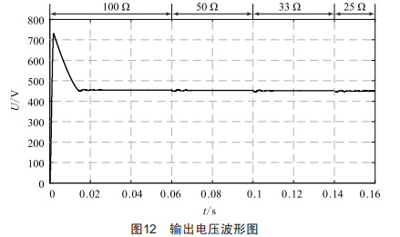 當諧振補償拓撲為LCL/S時,在0.06S,0.1S,0.14S處切換電阻,阻值依次為1000、500、330及250。電壓波形如圖12所示,電阻切換前后系統(tǒng)輸出電壓幾乎保持不變,在電阻切換時出現(xiàn)電壓震蕩,電壓短時間內穩(wěn)定在某一固定值,動力電池充電時,可認為其等效內阻是無級平滑變化,所以不會產生圖中所示的震蕩。