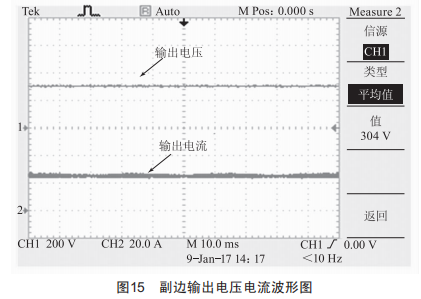 圖15為系統(tǒng)的輸出電壓、輸出電流波形圖,可看出,輸出電壓電流紋波非常小。