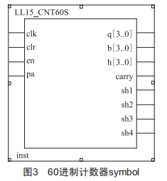 60進(jìn)制計數(shù)器其symbo1如圖3所示,引腳c1k是接受從60秒位計時器中來的進(jìn)位信號,并把這個時鐘信號導(dǎo)入到模塊中,即實際中計時60s記為1min:引腳c1r是控制清零功能的,當(dāng)系統(tǒng)收到從這個端口進(jìn)入的信號時,此計數(shù)器模塊內(nèi)的所有計時結(jié)果清零:引腳en是控制暫停功能的,當(dāng)系統(tǒng)收到從這個端口進(jìn)入的信號時,此計時器不管c1k口是否有信號,系統(tǒng)均保持計時不變,保持當(dāng)前狀態(tài):引腳pa為接受改變亮燈模式的輸入信號:引腳h[3..o]是輸出亮燈模式的類型的信號:引腳q[3..o]是輸出計時個位的結(jié)果信號,能顯示0到9:引腳b[3..0]是輸出計時十位的結(jié)果信號,能顯示0到6:引腳carry是輸出進(jìn)位信號,當(dāng)此計數(shù)器達(dá)到最大值即60時,系統(tǒng)則輸出一個進(jìn)位信號,同時系統(tǒng)計時結(jié)果清零。引腳sh1、sh2、sh3、sh4是在達(dá)到作息時間表中時間時向彩燈輸出信號,達(dá)到鬧鐘設(shè)定秒、分鐘位效果。