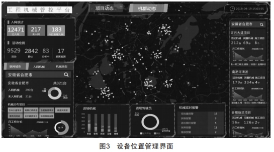 此外,管控平臺數(shù)據(jù)中心還可實時采集工程機械的位置、狀態(tài)、運行時間、油耗等相關(guān)信息,依據(jù)采集的數(shù)據(jù),對設(shè)備的運行狀態(tài)、油耗、作業(yè)指標(biāo)及路徑規(guī)劃等進行分析,為科學(xué)合理地利用工程機械提供依據(jù)。圖3為平臺中設(shè)備位置的管理界面。