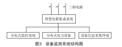 以智慧電箱作為網(wǎng)絡(luò)終端,實(shí)現(xiàn)對用電設(shè)備的健康狀態(tài)實(shí)時(shí)在線監(jiān)測,不必為每個(gè)用電設(shè)備安裝電力故障監(jiān)測模塊,節(jié)約成本的同時(shí),模塊化的智慧電箱集成系統(tǒng)簡化了安裝步驟,便于管理維護(hù)。如圖3所示,智慧電箱直接與分布式電力監(jiān)控系統(tǒng)、分布式用電設(shè)備、設(shè)備信息采集終端連接,為設(shè)備提供電能的同時(shí)對設(shè)備進(jìn)行實(shí)時(shí)監(jiān)控。