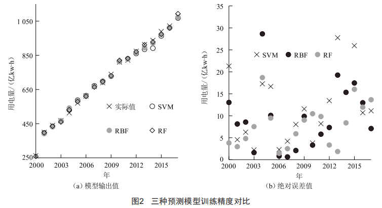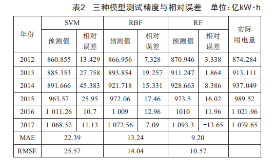 圖2和表2分別為RF算法計算得到的訓(xùn)練和測試樣本的預(yù)測結(jié)果,為比較算法優(yōu)越性,另使用RBF(徑向基神經(jīng)網(wǎng)絡(luò))、SVM(支持向量機(jī))實施建模預(yù)測。由圖可知,3種不同算法均能夠較好擬合用電量變化,訓(xùn)練樣本各年份用電量預(yù)測的MAE介于2.33~45.38億kw·h之間,表明訓(xùn)練模型精度可靠。訓(xùn)練模型統(tǒng)計顯示,RF、SVM、RBF訓(xùn)練模型的MAE依次為7.02億kw·h、7.72億kw·h、8.86億kw·h。測試結(jié)果表明,基于RF的預(yù)測結(jié)果最優(yōu),其MAE僅為9.20億kw·h,RMSE為10.57億kw·h,而基于SVM和RBF的預(yù)測結(jié)果的MAE和RMSE分別為22.39億kw·h、25.57億kw·h和13.24億kw·h、14.04億kw·h。綜合來看,基于RF的用電量預(yù)測模型精度高、預(yù)測效果良好。