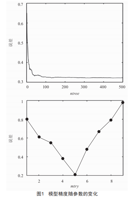 以2000一2011年的數(shù)據(jù)為訓(xùn)練樣本,2012一2017年的數(shù)據(jù)為檢測樣本,兩類樣本中解釋變量作為輸入值,用電量數(shù)據(jù)作為輸出值,在Rstudio1.0平臺上調(diào)用RandomForest程序包進(jìn)行編程實現(xiàn)。RF模型存在ntree和mtry兩個敏感參數(shù),其中ntree影響著模型泛化、收斂速率,mtry主要對節(jié)點分裂屬性賦值起重要作用。通常認(rèn)為,mtry最優(yōu)取值為變量的方根值,而ntree的篩選通常采用網(wǎng)格搜索法進(jìn)行。多次試驗表明,mtry為5時模型錯誤率相對較小,進(jìn)而確定mtry為5。隨著ntree的變化,模型錯誤率表現(xiàn)如圖1所示,可知當(dāng)其為200以后,模型錯誤率較小而平穩(wěn),遂設(shè)置ntree為500。