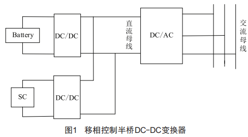 蓄電池/超級電容HESS根據(jù)儲能元件以及DC/DC變換器的位置不同分為多種結(jié)構(gòu)。圖1為一種廣泛使用的結(jié)構(gòu),蓄電池和超級電容通過DC/DC變換器并聯(lián)到直流母線,該結(jié)構(gòu)可以對每種儲能元件使用不同的控制策略,具有較高的靈活性和可靠性,本文中的混合儲能系統(tǒng)以這種典型的拓撲結(jié)構(gòu)為研究對象。