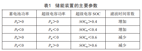 濾波時間常數(shù)的大小與延長蓄電池的循環(huán)壽命和儲能裝置間的能量轉(zhuǎn)移密切相關(guān)。調(diào)整濾波時間常數(shù)的大小時,需要考慮超級電容的荷電狀態(tài)。具體的參數(shù)調(diào)整方式如表1所示。
