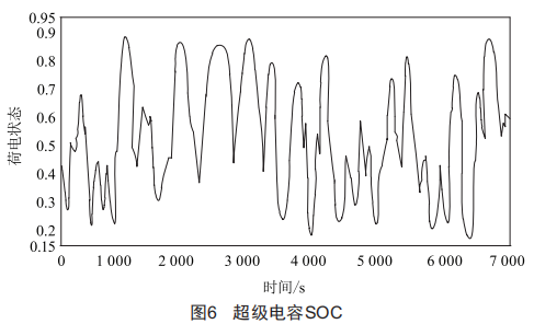 從圖3中可以看出,基于超級電容SOC的功率再分配策略的功率跟蹤補償效果較好。圖4和圖5分別驗證了蓄電池主要補償?shù)皖l功率部分和超級電容主要補償高頻功率部分。從圖6中可以看出超級電容SOC變化范圍為(0.15,0.95),因此能夠更充分地利用超級電容的容量。