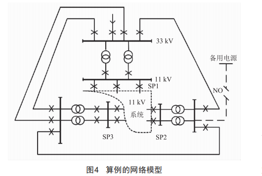 圖4是文獻所使用的IEEERBTs-BUs433kV高壓配電網(wǎng),含有多個環(huán)網(wǎng)以及備用電源。