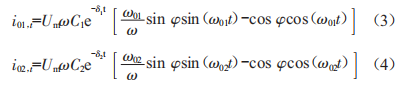 其中,虛擬電壓源為uf=Umsin(/l+o),解微分方程并略去穩(wěn)態(tài)量,可得故障點(diǎn)兩側(cè)暫態(tài)零模電流分別為: