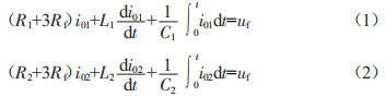 根據(jù)圖1(b)的簡(jiǎn)化模型,以零模電流i01、i02為變量,可得到回路電壓方程分別為: