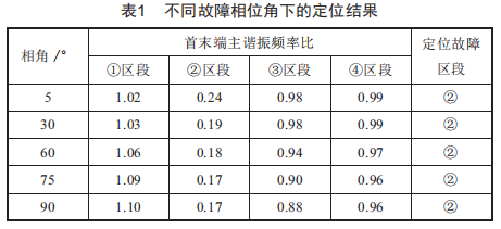 仿真中,首先考察不同接地故障相位角對(duì)定位結(jié)果的影響,設(shè)接地電阻為5Q,故障區(qū)段發(fā)生在②區(qū)段。按照前文的故障判據(jù),首先讀取各檢測(cè)點(diǎn)的暫態(tài)零模電流主諧振頻率,然后計(jì)算各區(qū)段首端和末端的主諧振頻率比值,如果比值小于0.5,則該區(qū)段為故障區(qū)段。表1給出了部分仿真結(jié)果。