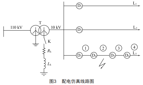 為驗(yàn)證定位方法的準(zhǔn)確性,下面對(duì)圖3所示系統(tǒng)進(jìn)行仿真。圖3中,共有3條10kV出線,分別為L(zhǎng)1、L2和L3,其中線路L1與L2均只有一段,線路L3分為①、②、③、④共4段。系統(tǒng)中有D1至D6共6個(gè)檢測(cè)點(diǎn),接地故障點(diǎn)位于D4、D5之間的②區(qū)段上。開(kāi)關(guān)K用于改變中性點(diǎn)的接地方式,可分別對(duì)不接地系統(tǒng)和經(jīng)消弧線圈接地系統(tǒng)進(jìn)行仿真。具體仿真線路參數(shù)為:L1=8km,L2=30km,①區(qū)段長(zhǎng)4km,②區(qū)段長(zhǎng)1km,③區(qū)段長(zhǎng)2km,④區(qū)段長(zhǎng)0.5km,正序阻抗為:1=0.17+j0.38Q/km,正序?qū)Φ貙?dǎo)納為b1=3.045us/km,零序阻抗為:0=0.23+j1.72Q/km,零序?qū)Φ貙?dǎo)納為b0=1.884us/km,各條線路等效負(fù)荷阻抗統(tǒng)一采用71=400+j20Q。