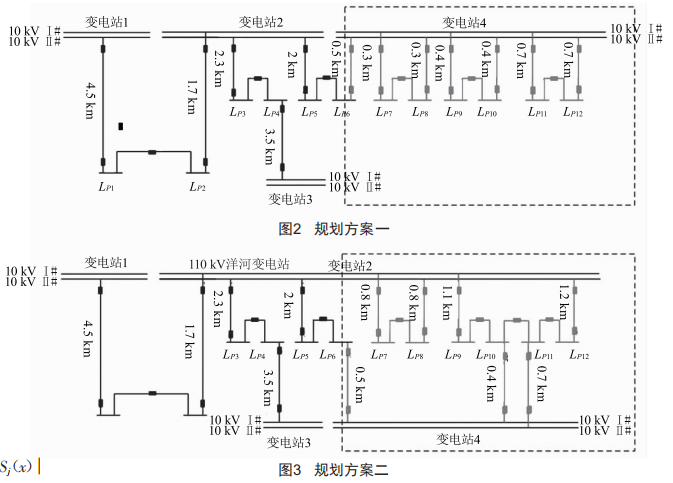 以某地區(qū)10kV配電網(wǎng)為例,基于全壽命周期的SEC量化評(píng)估模型對(duì)該配電網(wǎng)參與比選的方案一及方案二(圖2、圖9,虛線框內(nèi)為新建網(wǎng)架)進(jìn)行評(píng)估,不同方案中相應(yīng)供電線路的長度如圖中所示,不計(jì)聯(lián)絡(luò)線長度。