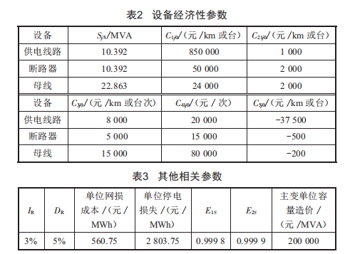 在SEC評(píng)估中,主要計(jì)及供電線路、開閉所進(jìn)線斷路器(包括聯(lián)絡(luò)線斷路器)及開閉所母線等三類設(shè)備,三類設(shè)備的平均使用壽命均為15年。設(shè)備的可靠性參數(shù)如表1所示。設(shè)備規(guī)劃起始年的經(jīng)濟(jì)性參數(shù)如表2所示,其他相關(guān)參數(shù)如表9所示。其中,C1a0、C21a0、C9a0、C41a0及C5a0為規(guī)劃(評(píng)估)初始年的相應(yīng)成本。