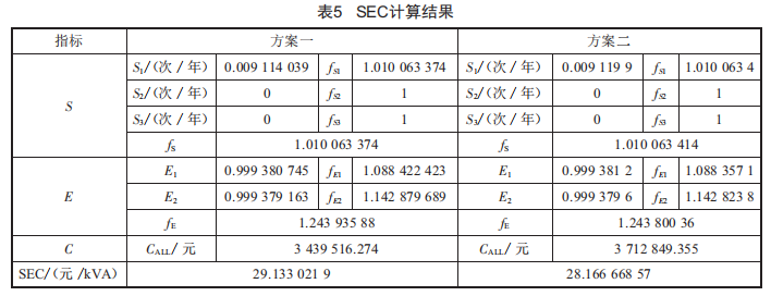 取規(guī)劃評(píng)估年限Nw為設(shè)備的平均使用壽命15年,則配電網(wǎng)兩個(gè)規(guī)劃方案的SEC相關(guān)計(jì)算結(jié)果如表5所示。表5中,CALL為評(píng)估中所有相關(guān)設(shè)備總的全壽命周期成本(等年值)。
