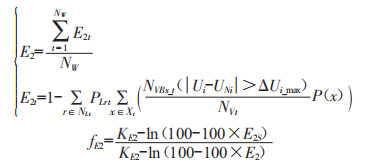 式中,ⅣVW和ⅣVBxW分別為評(píng)估期第W年電壓合格率的檢測節(jié)點(diǎn)數(shù)和系統(tǒng)狀態(tài)x下出現(xiàn)電壓越限的節(jié)點(diǎn)數(shù):UⅣi為節(jié)點(diǎn)i的額定電壓:AUim一a為節(jié)點(diǎn)i的最大允許電壓偏差:fE2為E2指標(biāo)因子:KE2為E2的調(diào)整系數(shù),通常取KE2=10[1]:E2s為E2的考核值。