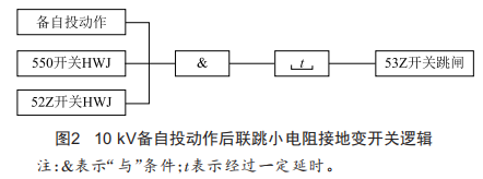 在正常接線方式下,當有故障跳開主變變低開關(guān),10kV母聯(lián)備自投動作合上10kV母聯(lián)開關(guān)時,兩段并列母線有兩臺接地裝置并列運行,需及時斷開另一套小電阻接地裝置。現(xiàn)在出現(xiàn)這一情況時由調(diào)控員對小電阻接地裝置進行遙控操作,操作時效難以保證。將小電阻接地變開關(guān)接入10kV備自投聯(lián)跳回路,在備自投成功合上母聯(lián)開關(guān)后,結(jié)合母聯(lián)開關(guān)及各小電阻接地變開關(guān)位置,經(jīng)一定時限自動跳開相應小電阻接地變開關(guān),可提高故障處置效率。以圖1接線方式為例,當10kV5M失壓備自投動作后,聯(lián)跳小電阻接地變53Z開關(guān)邏輯圖如圖2所示。