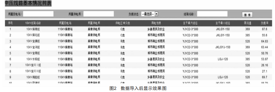 系統(tǒng)搭建完成后,對其運(yùn)行效果進(jìn)行檢測。將2019年收資的中壓公用配電線路現(xiàn)狀及存在問題情況數(shù)據(jù)表、公用配變現(xiàn)狀及存在問題情況數(shù)據(jù)表分別導(dǎo)入軟件(圖2),并選派規(guī)劃中心資深員工對同樣兩張表進(jìn)行統(tǒng)計(jì)分析,對比軟件與人工統(tǒng)計(jì)數(shù)據(jù)的時(shí)間及準(zhǔn)確性。檢測結(jié)果統(tǒng)計(jì)如表2所示。