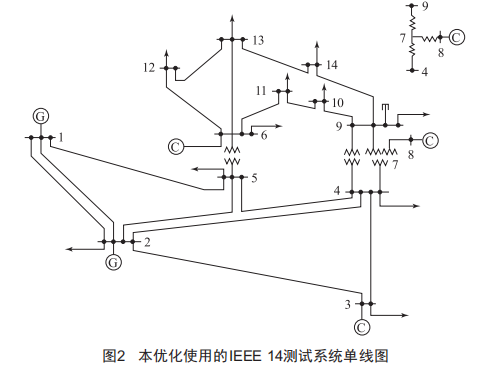本文以IEEE14母線電力測試系統(tǒng)(圖2)對本文中提出的規(guī)劃模型進(jìn)行優(yōu)化。