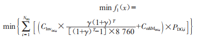 式中,/l(x)為每小時(shí)的成本函數(shù),是以年利率計(jì)算的DG總費(fèi)用:NDG是DG節(jié)點(diǎn)數(shù):CInvDG,i是DG在第i個(gè)節(jié)點(diǎn)的投資費(fèi)用(S/Mw):y是利率:7是范圍周期時(shí)間(20年):PDG,i表示在第i個(gè)節(jié)點(diǎn)的DG容量(Mw):Co&MDG,i是在第i個(gè)節(jié)點(diǎn)的DG運(yùn)行和維護(hù)費(fèi)用(S/Mwh)。