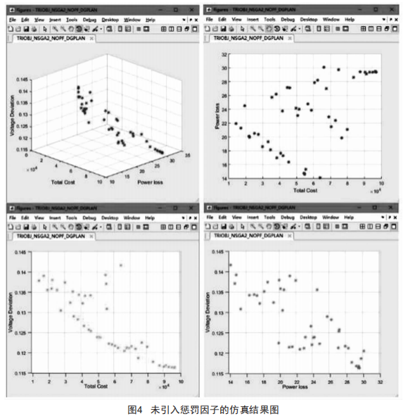 (1)通過對含有總費(fèi)用、損耗與電壓偏差的3D圖像的比較可以看出,當(dāng)未引入懲罰因子時(shí),3D空間圖中的點(diǎn)是高度離散的:當(dāng)引入懲罰因子后,可以看出圖中的點(diǎn)近似于平滑曲線。