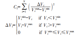 式中,vi表示在第i節(jié)點(diǎn)的電壓大小:viSpec為第i節(jié)點(diǎn)的標(biāo)稱電壓值,在運(yùn)行Matpower中最優(yōu)潮流命令后可以得到:vimax與vimin代表了第i節(jié)點(diǎn)最大和最小電壓值。