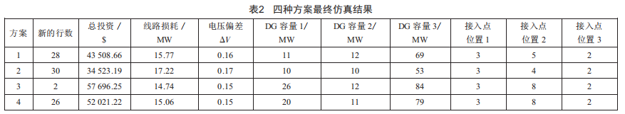 從方案2~4可以看出,設(shè)計(jì)者分別把總投資、線路損耗和電壓偏差作為主要的優(yōu)化目標(biāo),經(jīng)過NSGS-Ⅱ仿真算例,重新整理的4種方案最終仿真結(jié)果如表2所示。根據(jù)表2得到4種優(yōu)化模式的系統(tǒng)運(yùn)行情況和經(jīng)濟(jì)效益的對比,可知面對設(shè)計(jì)者不同的偏好,最終的優(yōu)化結(jié)果是不同的。針對未來滿足不同的決策者,在實(shí)際的DG規(guī)劃中,情況的選擇將會比本文中的情況更加復(fù)雜。