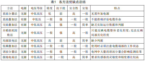 通過以上研究發(fā)現(xiàn),絕緣在線監(jiān)測技術和手段有很多種,每種方法都有各自的優(yōu)缺點,如表1所示。