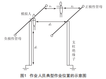 試驗管母間帶電作業(yè)的相間最小安全距離時,分為作業(yè)人員在負極性管母處和在正極性管母處進行等電位作業(yè)兩部分進行。試驗中將模擬人放置在負極性或正極性管母處,并用銅導線將模擬人和管母連接,使二者保持等電位,試驗中兩管母的距離d2可以調(diào)整。具體試品布置示意圖如圖1所示。