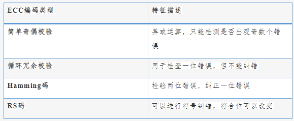 2. 增加ECC(ECC:ECC校驗(yàn),Error Checking &Correcting)的功能,即存儲(chǔ)芯片的數(shù)據(jù)糾錯(cuò)功能,它是比較先進(jìn)的存儲(chǔ)芯片錯(cuò)誤檢查和更正的手段,按照對(duì)信源的處理方式ECC可以分為線性分組碼和卷積碼,用于存儲(chǔ)芯片的是線性碼,如下表所示。