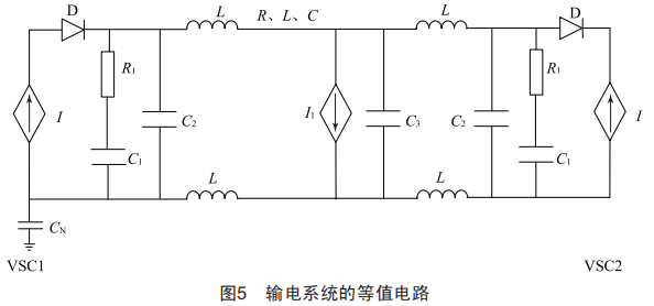 以圖5所示的等值電路簡化表示整個輸電網(wǎng)絡(luò)。當換流器端電壓加在線路上時,直流輸電線路將不斷充電而產(chǎn)生過電壓,并在線路上發(fā)生傳遞。直流線路端部電壓在末端開路時將大幅升高,流過換流閥的電流在換流閥不能正向?qū)〞r減小為0,換流器處于閉鎖狀態(tài)。在換流閥閉鎖前,圖5所示的VSC1換流站的母線電壓額定值變?yōu)殚]鎖后的線路首端電壓,電壓突變將會引起線路發(fā)生高頻振蕩。