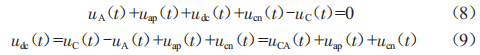 式中,.A(1)、.C(1)分別為換流站出口A相、C相瞬時電壓:.CA(1)為AC相間的瞬時相電壓:.ap(1)、.cn(1)為A相、C相二極管瞬時電壓。