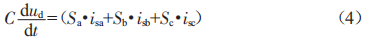 式中,RS表示兩側(cè)的電阻損耗:Sj(j=a、b、c)表示三相上橋臂開關(guān)函數(shù):.Sj、iSj(j=a、b、c)分別表示交流三相電壓和電流的瞬時值。